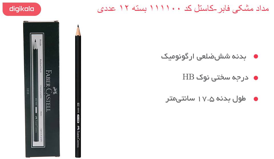 «مداد مشکی فابر-کاستل کد ۱۱۱۱۰۰» با طراحی کلاسیک خود، نظر بسیاری از افراد را جلب میکند. بدنهی این مداد به صورت ارگونومیک و ششضلعی ساخته شده است. این ویژگی باعث میشود مداد بهراحتی در دست قرار گیرد و هنگام استفاده، فشار کمتری به انگشتان وارد شود. مداد مشکی فابر-کاستل با نوک HB مدادی مناسب برای طراحی و همچنین افرادی است که در امتحان کنکور شرکت میکنند.