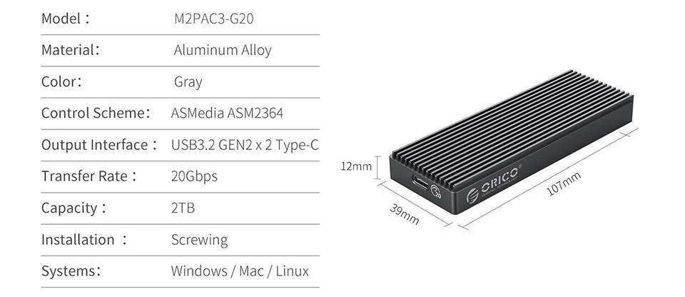 باکس M.2 NVMe SSD اوریکو مدل M2PAC3-G20 علاوه بر کاربردی بودن از کیفیت بالایی برخوردار است و به آسانی نصب خواهد شد. این قاب دارای خروجی Type-C از نوع USB Type-C USB 3.2 GEN2 است و بر اساس ادعای اوریکو قابلیت انتقال دادهها و خواندن و نوشتن اطلاعات تا سرعت ۲۰۰۰ مگابایت در ثانیه این محصول را از نمونههای مشابه موجود در بازار متمایز کرده است. یکی دیگر از ویژگیهای بسیار خوب این باکس این است که از آلومینیوم ساختهشده و میتواند تا حد بالایی در برابر ضربات و فشار تاب بیاورد. یکی درگر از مزایای آلومینیوم این است که میتوان از آن بهعنوان هیتسینک هم استفاده کرد و در خنک کنندگی باکس میتوان د سیار موثر باشد. این باکس از SSD تا ۲ ترابایت ظرفیت پشتیبانی میکند. با استفاده از این قاب اوریکو قادر خواهد بود حافظه SSD از نوع NVMe را به تلویزیون متصل کنید و از دیدن سریال یا فیلم لذت ببرید. اگر پلیاستیشنی دارید که حافظهای به اندازه کافی برای تمام بازیهایتان ندارد، با خیال راحت میتوانید با استفاده از این محصول SSD را به حافظه پلیاستیشنتان اضافه کنید. حتی میتوانید با اتصال حافظهتان به روتر، فیلم یا فایل موردنظرتان را بهسرعت دانلود و ذخیره کنید. همانطور که گفتیم به لطف کانکتور USB-C هم قادر خواهید بود حافظهای خارجی برای گوشی یا لپتاپ بالاردهتان داشته باشید. سایز جیبی و کوچک آن حمل و نقل این باکس را برای شما آسان کرده و باعث شده است که به راحتی در جیب و کیف شما قرار گیرد و جای زیادی را اشغال نکند.