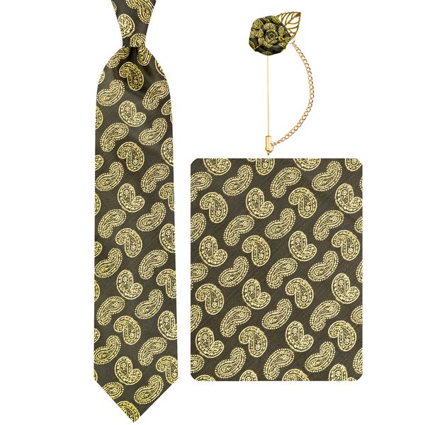 ست کراوات و دستمال جیب دور دوزی شده و گل یقه کت همرنگ خود پارچه است.