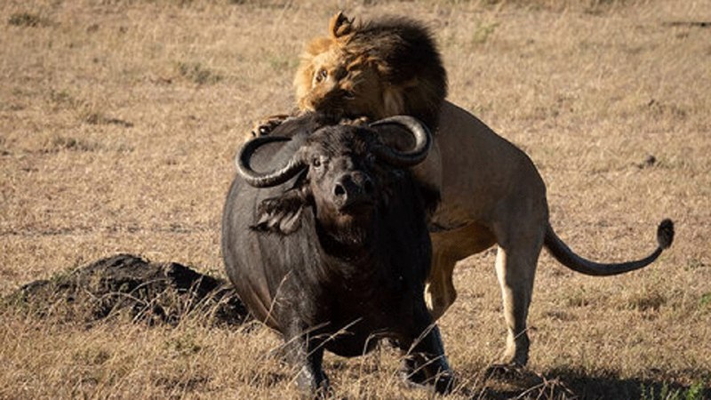تعدادی شیر، مقابل چشمان توریستها به یک بوفالو حمله کردند.