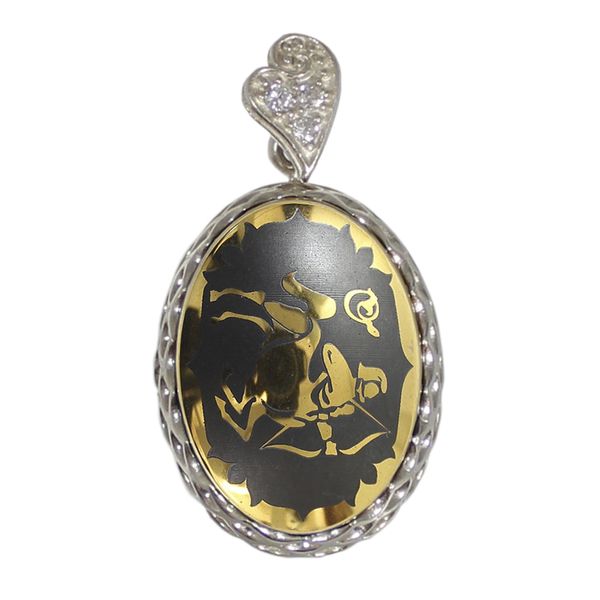 نگین این آویز سنگ حدید است .با نماداسب با سیمای انسان ,آذر ماه که که به رنگ مشکی و طلایی می باشد