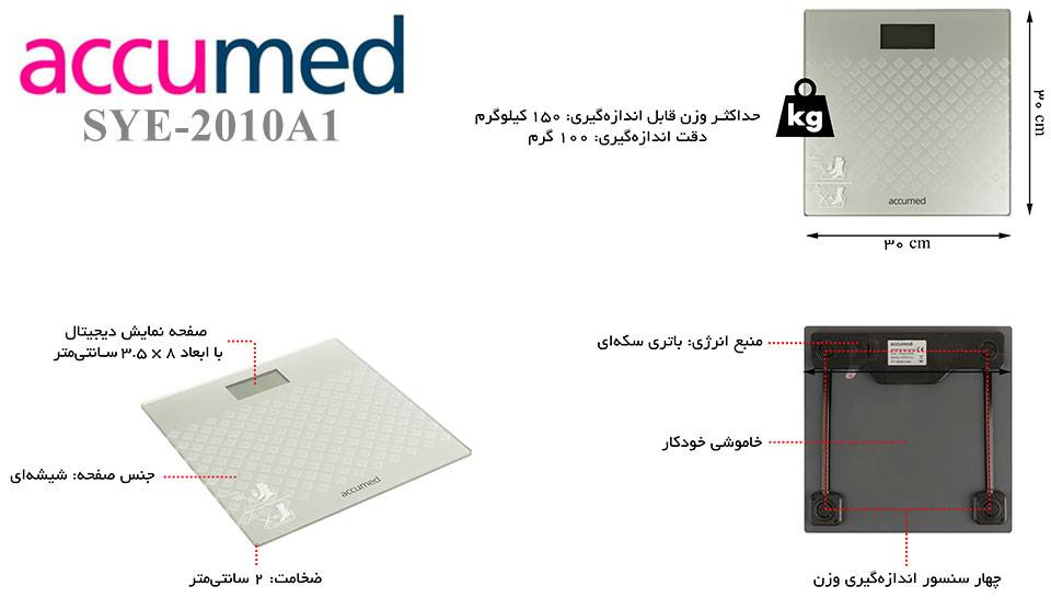 ترازوی «اکیومد» (Accumed) مدل «SYE-2010A1» ترازویی دیجیتال مجهز به چهار سنسور اندازهگیری وزن و حداکثر وزن قابلاندازهگیری ۱۵۰ کیلوگرم است. سطح ترازو شیشهای است و زیر آن چهار سنسور هوشمند اندازهگیری وزن قرار دارد. SYE-2010A1 میتواند وزن افراد را بین ۵ تا ۱۵۰ کیلوگرم اندازهگیری کند. چنانچه وزنی بیشتر از ۱۵۰ کیلوگرم روی ترازو قرار بگیرد، پیغام خطا نمایش داده میشود. دقت اندازهگیری این ترازوی دیجیتال ۱۰۰ گرم است که برای یک ترازوی خانگی مقداری استاندارد محسوب میشود. صفحهنمایش ترازو از نوع دیجیتال بدون نور پسزمینه است و اندازهی بزرگ آن، خواندن وزن اندازهگیریشده را آسان میکند. برای اندازهگیری وزن کافی است با پا ضربهای آرام روی سطح ترازو بزنید تا روشن شود. با ایستادن روی سطح ترازو پس از چند ثانیه، عدد وزن ثابت میشود. واحد نمایش وزن را میتوان توسط دکمهی پشت ترازو بین سه واحد کیلوگرم، پوند و استون تغییر داد. انرژی موردنیاز ترازو را یک عدد باتری سکهای تأمین میکند که در پشت آن جای میگیرد. دقت ترازو با توجه به سنسورهای هوشمندی که دارد، خوب است. برای اندازهگیری دقیق وزن باید ترازو را روی سطح کاملا سخت و صاف قرار داد. بهطورخلاصه Accumed SYE-2010A1 ترازویی دیجیتال با چهار سنسور هوشمند؛ حداکثر وزن قابلاندازهگیری ۱۵۰ کیلوگرم؛ دقت ۱۰۰ گرم؛ نمایش وزن با واحدهای کیلوگرم، استون و پوند و منبع انرژی باتری سکهای است.