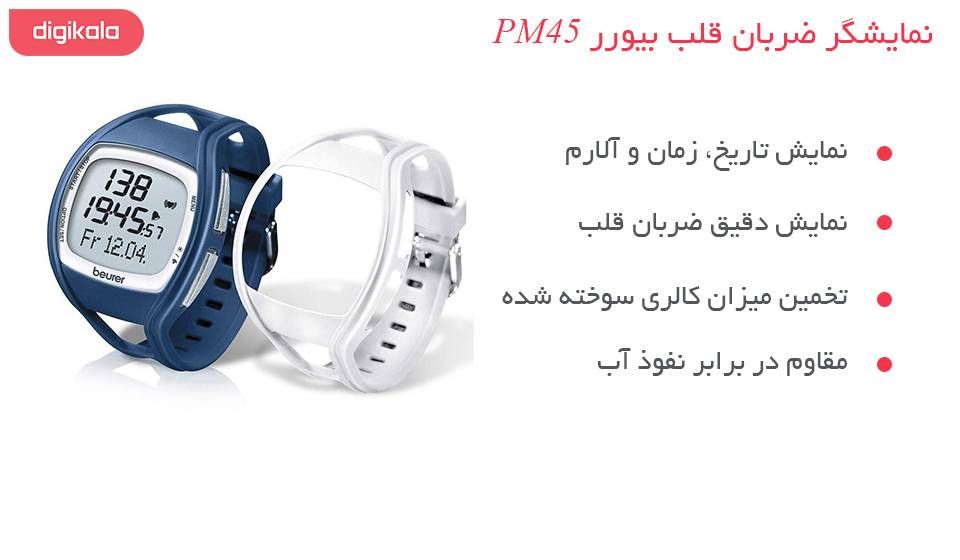 این نمونه دارای ویژگی های زیر میباشد: – ساعت زنگ دار ضد آب نبض سنج – نمایشگر ضربان قلب با بند قابل تعویض یک ساعت با دو بند – ساعت نبض سنج با قابلیت تعویض بند برای هماهنگ کردن با لباس ورزشی – شامل ۲ بند آبی و سفید هنگام خرید متناسب با هر نوع لباس ورزشی – بند ساعت مچی قابل تهیه در رنگهای مختلف و شیک