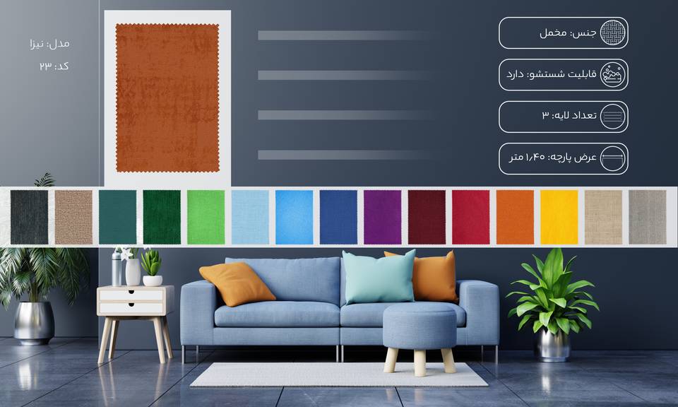 داشتن مبلی که سالهای طولانی سالم باشد و علاوه بر ساختار بدنه محکم، مستلزم پارچه مبلی مرغوب است؛ همین باعث شده تا ما به شما استفاده از پارچهای را پیشنهاد دهیم که برای استفاده تخصصی در صنعت مبلمان تولید شده است. در صورت تمایل میتوانید کوسنهای کوچک که ست با رنگ مبلمانتان باشد از این پارچه تهیه کنید.