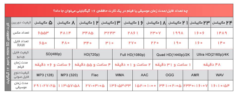 شاید برایتان جذاب باشد بدانید، دوربین حرفهای شما یا گوشیتان با یک کارت حافظهی ۱۶گیگابایتی میتواند چند عکس ثبت کند، چقدر موسیقی در خود جا دهند یا حتی چه مدتی میشود با آن فیلم ضبط کنید؛ البته توجه داشته باشید که این تعداد یا زمانهای نوشتهشده، کاملا تقریبی هستند و هیچ تضمینی برای این تعداد وجود ندارد.