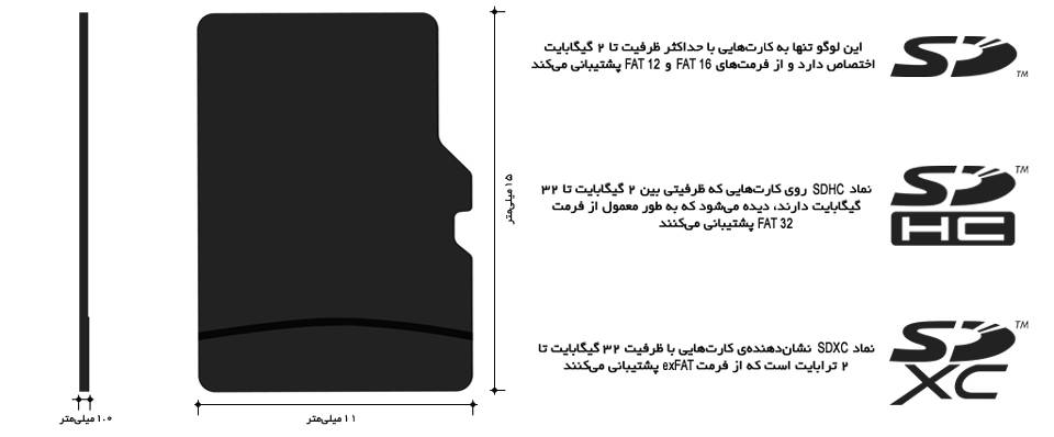 کارتهای حافظه microSD کوچکتر از حافظههای SD هستند؛ آنها حافظههایی با ظرفیت زیاد هستند و با پسوند SD، SDHC و SDXC نامگذاری میشوند. انواع استانداردهای SD، SDHC و SDXC هم با توجه به افزایش ظرفیت ذخیرهسازی این کارتها تعریف شدهاند که معمولا تا ظرفیت ۲ گیگابایت با استاندارد SD، از ۲ تا ۳۲ گیگابایت با استاندارد SDHC و از ۳۲ گیگابایت تا ۲ ترابایت هم با استاندارد SDXC تولید و عرضه میشوند.