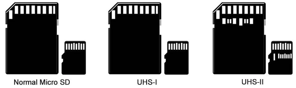 کلاس ۱۰ / UHS1 / U1: رسیدن به این سرعت از انتقال دیتا را میتوان تحولی در micro SDها دانست. از این کلاس به بعد دو مفهوم جدید که با نامهای “کلاس بازده برنامه” و “کلاس سرعت UHS” شناخته میشوند که برای معرفی صحیحتر و شناخت نوع کاربری کارتها به آنها اضافه شدند. از کلاس ۱۰ به بعد ۴ نوع کلاس سرعتی متفاوت وجود دارد؛ کلاس سرعت که نشاندهندهی سرعت انتقال ۱۰ مگابایت بر ثانیه است. کلاس UHS که مفهوم جدیدی است، با درج لوگوهای UHS1 یا UHS2 روی micro SDها مشخص میشود. معمولا کلاس سرعتی UHS با یک حرف U که در داخلش عددی نوشته شده است، نشان داده میشود؛ همچنین این کلاس مفهومی به نام سرعت BUS دارد که با اعداد یونانی نمایش داده میشوند و نشاندهندهی سرعت باس کارت حافظهی جانبی است که معمولا برای هماهنگی با سختافزار شما کاربرد دارد. باس این نوع کارتها میتواند UHS-I یا UHS-II باشد. باس UHS-I با سرعتهای ۱۲.۵(SDR12)، ۲۵(SDR25)، ۵۰(SDR50, DDR50) و ۱۰۴(SDR104) که بر حسب مگابایت بر ثانیه هستند و با نام معادلی که در داخل پرانتز نوشته شده، قابلشناسایی است. باس UHS-II هم با سرعتهای ۱۵۶(FD156) و ۳۱۲(HD312) مگابایت بر ثانیه هستند و با نامهای متناظر با هر سرعت شناسایی میشوند. روش جذاب دیگری که میتوان کارتهایی با باس UHS-II را از سایر micro SDها تشخیص داد، از دو ردیف پین استفادهشده روی آنهاست که برای انتقال پرسرعت اطلاعات وجود آنها منطقی است.