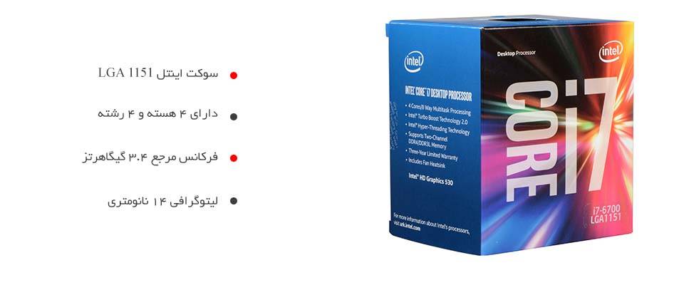 پردازنده مرکزی Core i7-6700 شرکت اینتل (Intel)، جز ششمین نسل از پردازندههای این شرکت است که با استفاده از معماری اسکایلیک (Skylake) ساخته شدهاند. این سری از پردازندههای اینتل با فناوری ساخت (لیتوگرافی) ۱۴ نانومتر تولید شدهاند که به مصرف توان کمتر و بازده بیشتر منجر میشود. برای نصب این پردازنده همانند تمام پردازندههای سری اسکایلیک به مادربردی با سوکت LGA 1151 اینتل و چیپست Z170 نیاز خواهید داشت. این پردازنده مرکزی دارای ۴ هسته پردازشی و ۸ رشته (Thread) است. با وجود ۴ هسته، پردازنده میتواند چندین برنامه بهصورت همزمان اجرا کند و عملکرد کلی سیستم هم دچار افت نشود؛ در حالی که استفاده از ۸ رشته باعث میشود پردازنده بتواند وظایف محوله را بهصورت موازی پیش ببرد و به سرعت بالاتر سیستم کامپیوتری منجر شود. فرکانس مرجعی که Core i7-6700 در آن فعالیت میکند ۳.۴ گیگاهرتز است که با وجود فناوری کمکی۲.۰ Turbo Boost، پردازنده قادر است خود را تا فرکانس ۴ گیگاهرتز هم بالا بکشد. ۸ مگابایت حافظه کش سطح سه (L3) هم در این پردازنده به کار رفتهاست. حافظه کش سطح سه که اینتل آنرا Smart Cache مینامد، با به وجود آوردن حافظهیای بسیار سریع جهت ذخیرهسازی دادههایی که در صف پردازش هستند، به پردازنده کمک میکند عملکرد و سرعت کلی خود را تا آنجا که میتواند ارتقا دهد. پردازنده Core i7-6700 اینتل میتواند حداکثر ۶۴ گیگابایت حافظهی رم DDR4 با فرکانسهای ۱۸۶۶ / ۲۱۳۳ مگاهرتز و DDR3L با فرکانسهای ۱۳۳۳ / ۱۶۰۰ را آدرسدهی کند تا بتوانید از حداکثر توان پردازنده خود استفاده کنید. وجود پردازندهی گرافیکی Intel HD Graphics 530 و پشتیبانی از مجموعه دستورالعملهای SSE4.2 و AVX 2.0 و سری جدید دستورالعملهای AES نویدبخش بروز بودن پردازنده و پشتیبانی آن از API های جدید برنامهنویسی است. قدم اول برای داشتن یک سیستم کامپیوتری قدرتمند، انتخاب یک پردازنده مناسب است. پردازنده Core i7-6700K برای کامپیوتر مخصوص بازی کردن و اجرای جدیدترین بازیها با حداکثر جزییات توصیه میشود. علاقمندان به اورکلاک و ادیت فیلم و طراحان هم میتوانند پردازنده Core i7-6700K را به عنوان یک انتخاب عالی مد نظر داشتهباشند.