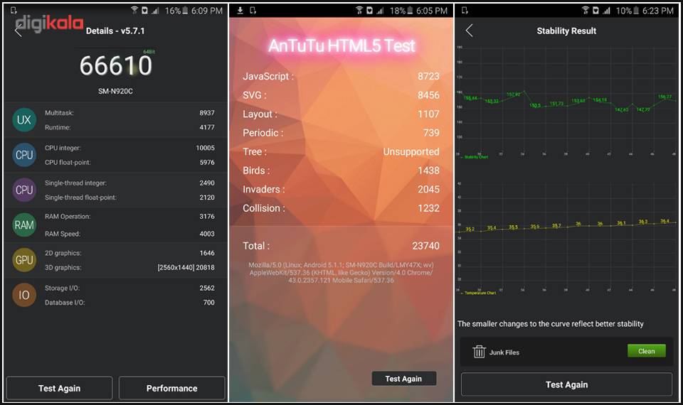این مجموعهی سختافزاری توانست نمرهی عالی ۶۶۶۱۰ را در آزمون AnTuTu کسب کند؛ همچنین در آزمون پایداری در شرایط مختلف تا ۳۷ درجهی سانتیگراد گرم شد. سرعت رم این گوشی تقریبا برابر سرعت رم رقبایی مثل سونی اکسپریا Z3 پلاس و الجی G4 است. نقطهی اوج این سختافزار در بخش آزمون پردازندهی گرافیکی بود که از ۶۰ فریم ورودی با رزولوشن 2K، تمامی این ۶۰ فریم را پردازش کرد و به تصویر کشید. در گوشی سونی اکسپریا Z3 پلاس هم شاهد پردازش هر ۶۰ فریم بودیم؛ اما در آن گوشی این ۶۰ فریم با کیفیت fullHD برای پردازنده ارسال میشدند. پردازش و نمایش این تعداد فریم برای پردازندهی گرافیکی نوت ۵ عالی است.