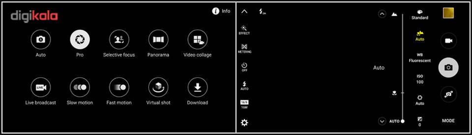 رابط کاربری دوربین ساده است و آیکونهایی برای دسترسی سریع به موارد دمدستی در صفحهی اصلی وجود دارند. این آیکونها شامل انتخاب سایز عکس، حالت فلش، تایمر عکاسی، HDR و افکتگذاری روی تصاویر میشوند. کلیدهای عکاسی و فیلمبرداری هم در کنار هم قرار گرفتهاند تا بتوان در سریعترین زمان ممکن به آنها دسترسی داشت. حالتهای اتوماتیک، پیشرفته، پاناروما، فوکوس انتخابی و ارسال زندهی تصویر در شبکه یوتیوب را میتوان در منویی جداگانه انتخاب کرد. حالت جدید «ارسال زندهی تصویر» میتواند ویدیوهای شما را با تاخیر ۱۰ ثانیهای، روی شبکهی یوتیوب به نمایش بگذارد. حالت «پیشرفته» بسیار کارآمد به نظر میرسد. در این حالت میتوانید تنظیمات مربوط به اشباع رنگ، فوکوس، تراز سفیدی، مقدار ISO و سرعت شاتر را بهصورت دستی کنترل کنید. نکتهی جالب اینکه میتوانید هرکدام از این تنظیمات را در حالت اتوماتیک قرار دهید و مواردی را که نیاز دارید، بهصورت دستی تغییر دهید. امکان ثبت تصاویر در فایل فرمت RAW هم یکی از امکانات جدید رابط کاربری دوربین این گوشی است.